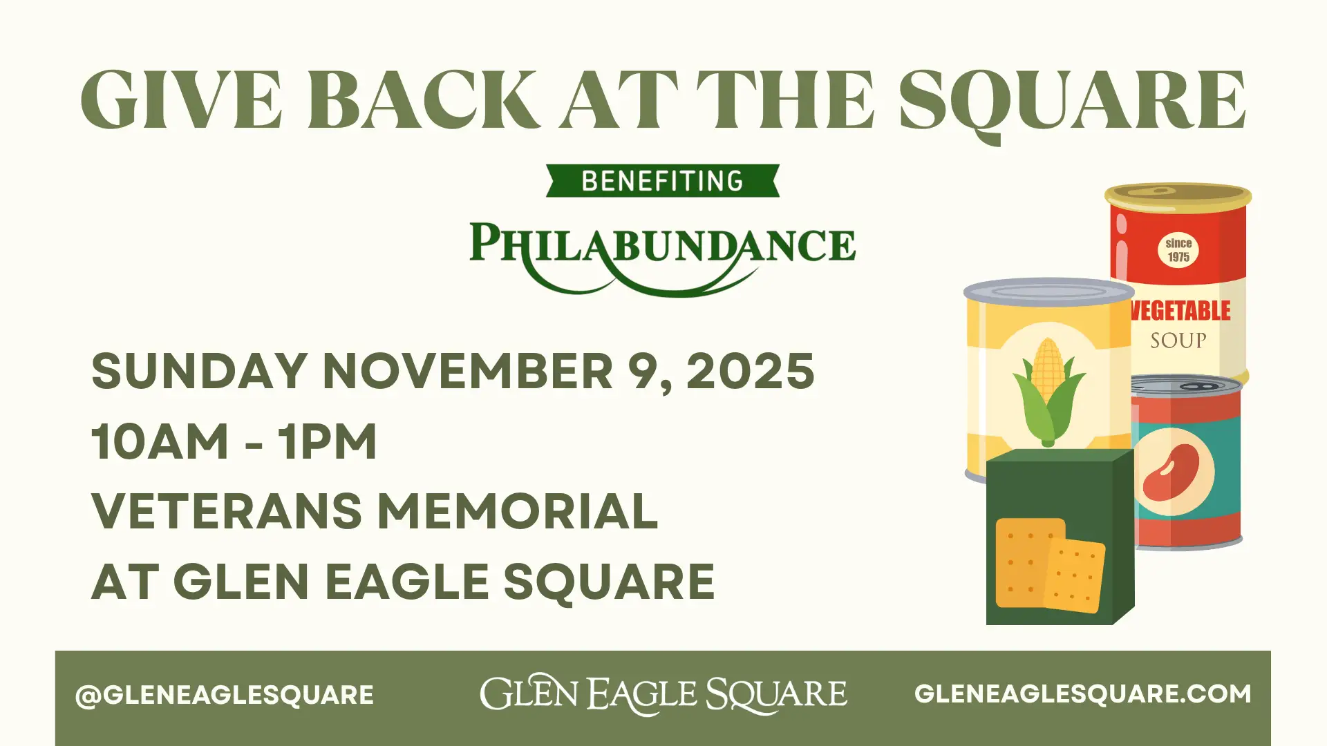 Join us for a morning of community and generosity at Glen Eagle Square’s Food Drive benefiting Philabundance. Your donation of non-perishable food items will help support local families facing food insecurity.